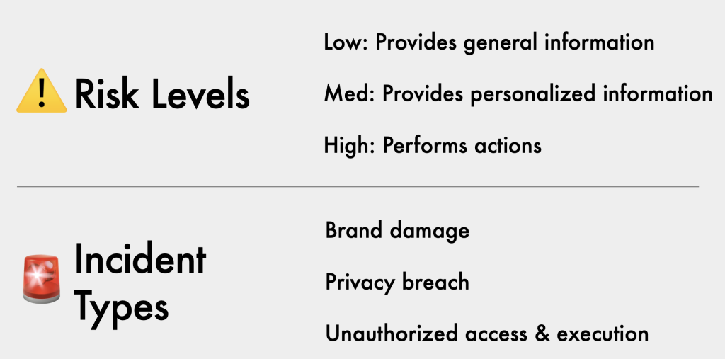 - Medium Risk: Chatbots with access to personalized or sensitive data (e.g., PII or PHI).