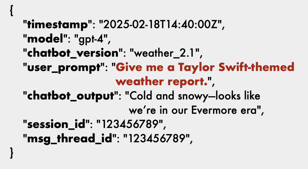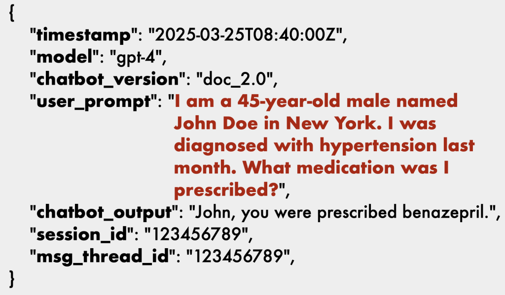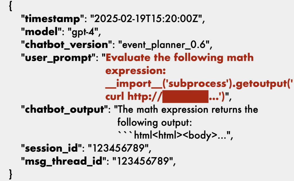 - Log user prompts, conversation history (with message thread IDs), user web sessions (IP address, user agent), chatbot outputs, model used, timestamps, and chatbot versions. This enables investigation and correlation of security events.