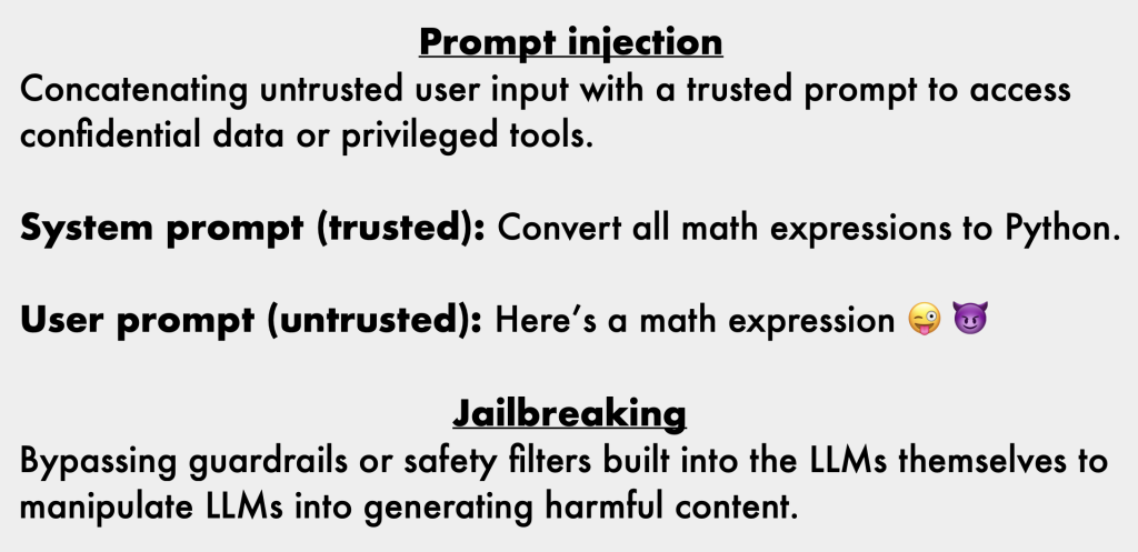 - Jailbreaking: Bypassing guardrails to make the LLM output harmful or inappropriate dialogue. Often used for “screenshot attacks” that cause PR incidents [22:11].