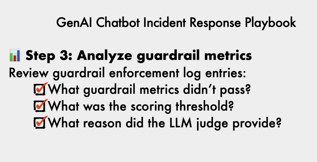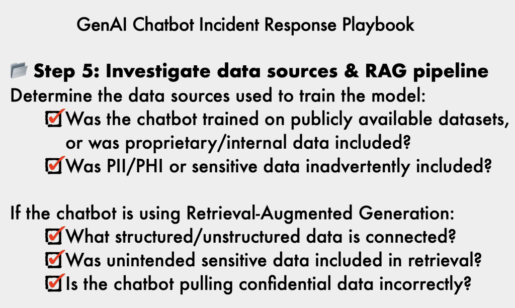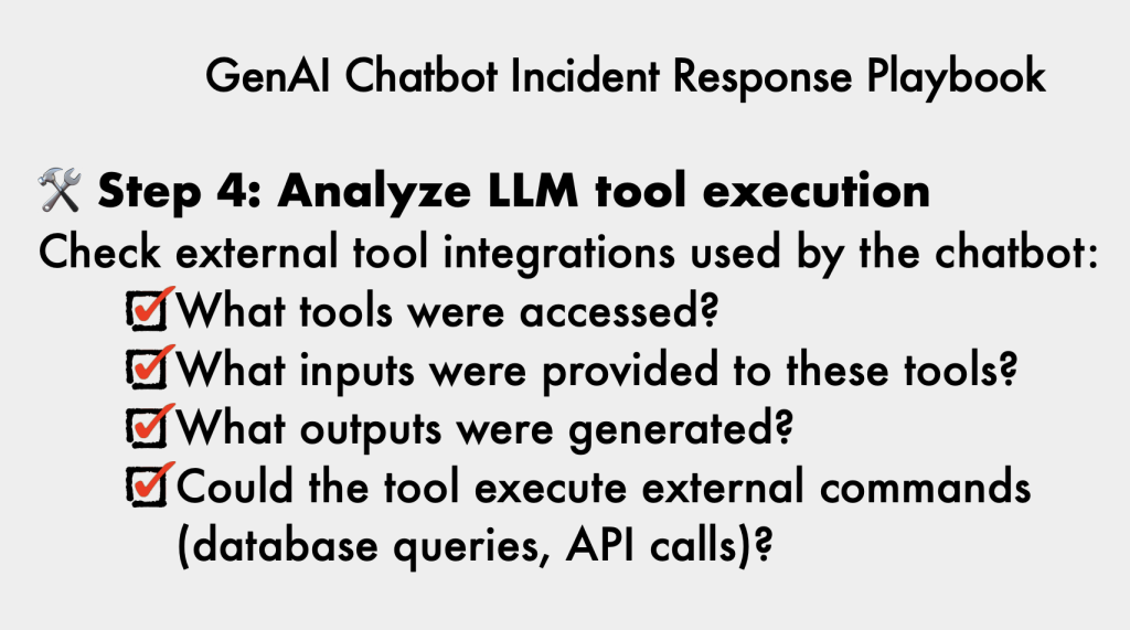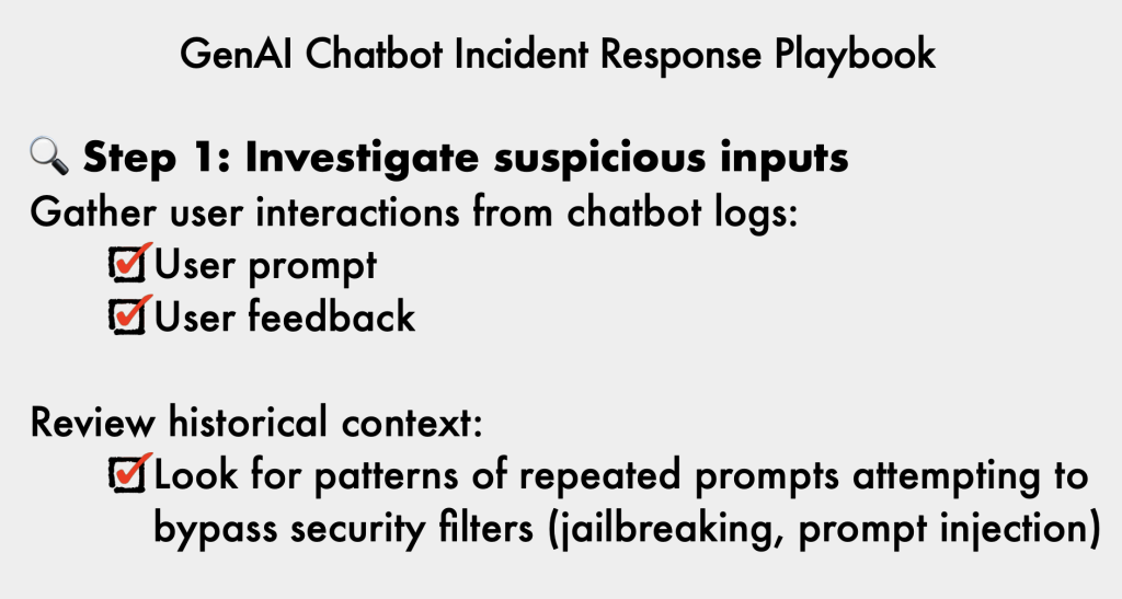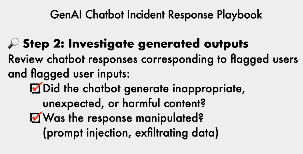 - Investigate Outputs: Check chatbot responses for inappropriate content, manipulation, or evidence of data exfiltration.
