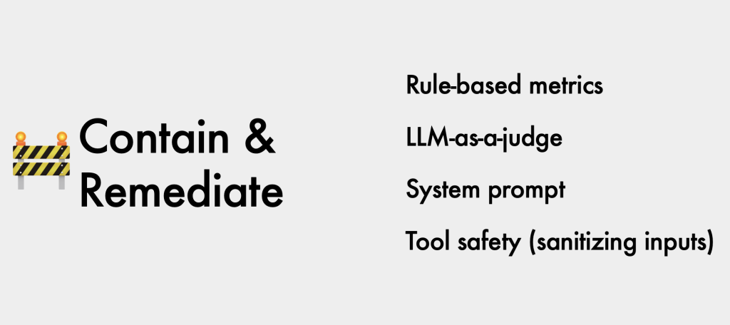 - Contain and Remediate: Utilize rule-based metrics, LLM judges, system prompts, and external tool safety measures.