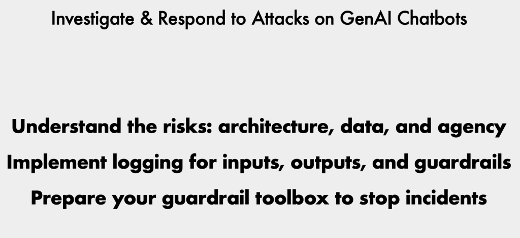 The talk concludes by emphasizing the importance of understanding chatbot architecture, data access, and potential attacks, and ensuring proper logging and robust guardrails are in place to prepare for generative AI chatbot incidents [36:47].